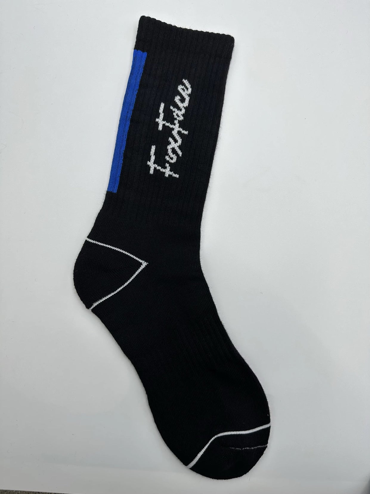 A bold twist on a classic. The black FoxFace crew socks feature a striking royal blue stripe and crisp logo detailing. Designed with comfort and streetwear edge in mind, these are your go-to everyday pair with just the right amount of flair. Pair it with any of our Jumpsuits or our Signature Glider