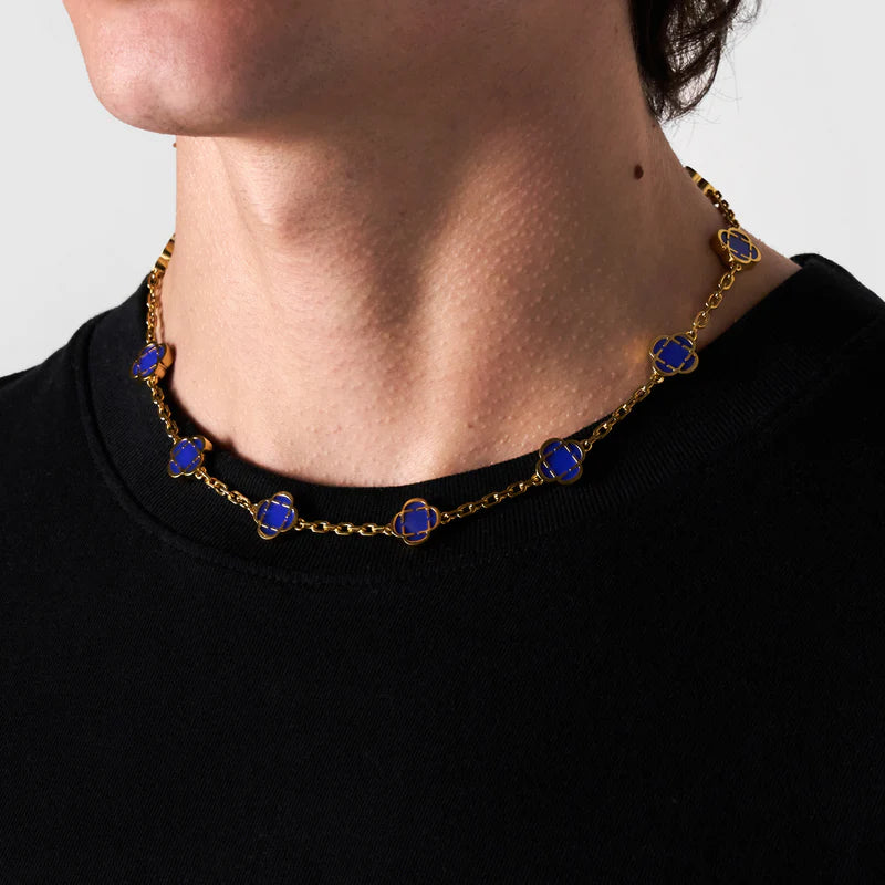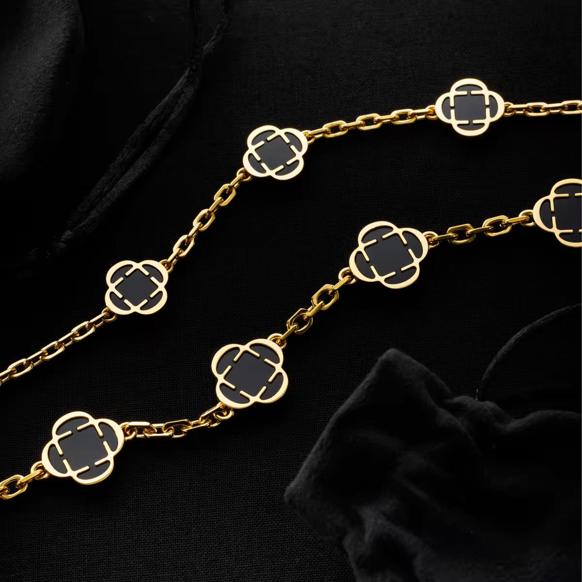 The Fortis Clover Link is crafted with a series of bold 4-leaf clover emblems, each framed in 18K gold and finished with a deep black inlay. Designed to mirror the richness of natural onyx, the surface is sealed with a durable, scratch- and fade-resistant coating. Precision-cut links create a seamless drape along the neckline, while the snap-proof clasp ensures lasting security and strength.