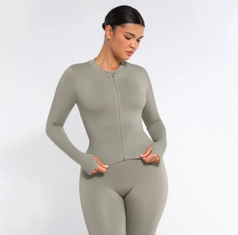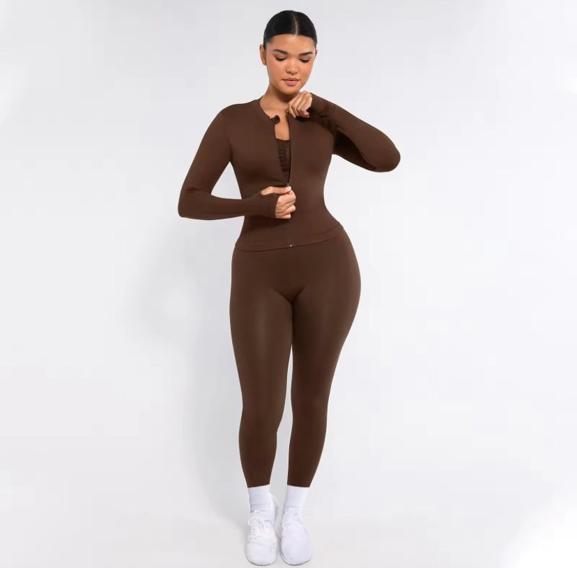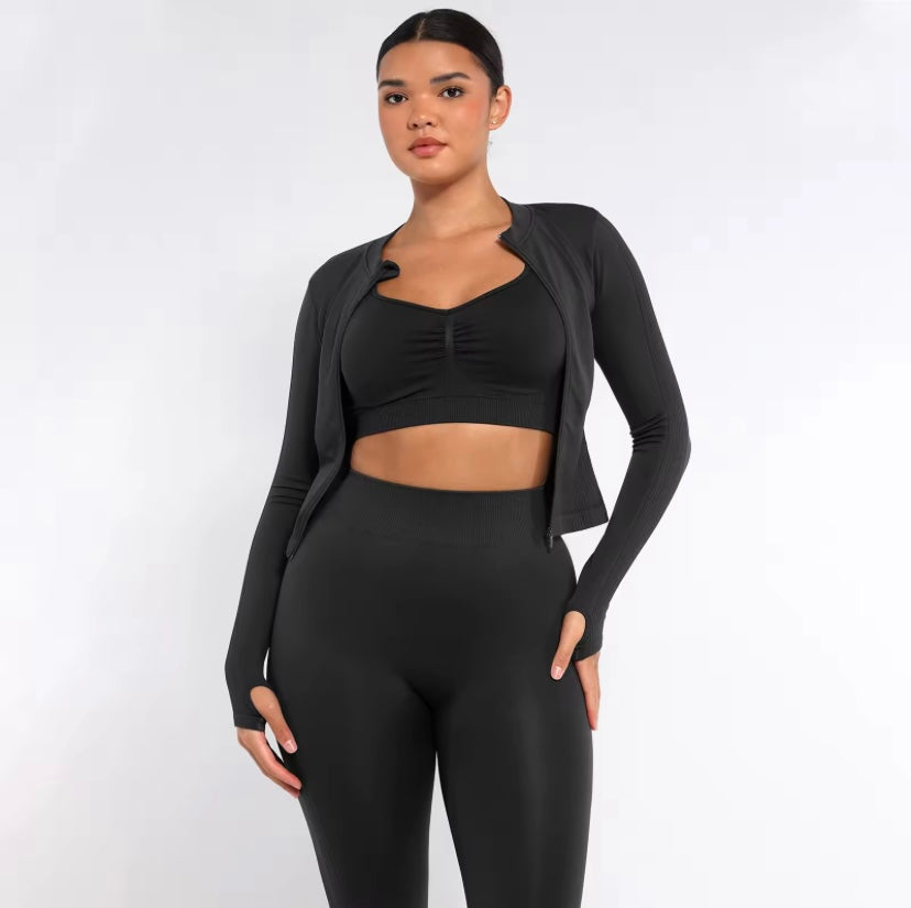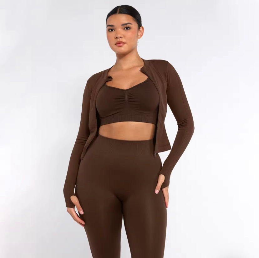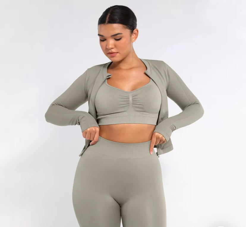 Upgrade your activewear game with the ultimate triple threat: a sculpting sports bra, figure-hugging leggings, and a lightweight zip-up jacket — all designed to move with you. Made with ultra-soft, stretchy seamless fabric that lifts, smooths, and supports in all the right places.